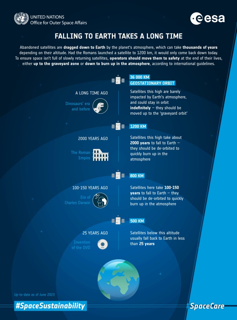 OneWeb satellites operate at 1,200 kilometers and would take around 2,000 years to reenter the atmosphere without intervention.